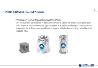 The document discusses inertial navigation systems (INS) and their use in dynamic positioning (DP) applications. An INS uses gyroscopes and accelerometers to continuously calculate position without external references. While INS drift over time, integrating additional sensors like acoustic positioning, Doppler velocity logs, and GPS can significantly improve accuracy through data fusion. The document examines how pairing an INS with acoustic positioning systems can provide reliable, high-accuracy positioning even if individual sensors fail or are unavailable. It suggests INS combined with acoustic loggers is sufficient redundancy and accuracy for many DP applications.