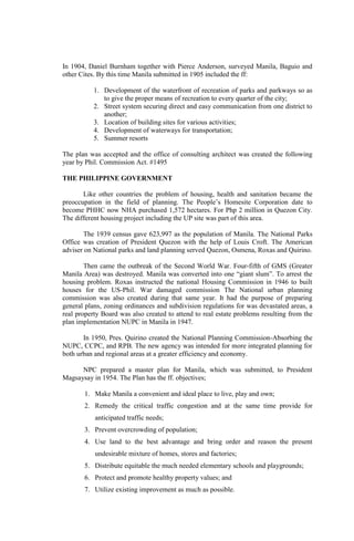 This document provides a history of planning and development of cities and towns from ancient times to the modern era. It discusses how pre-Hispanic communities in the Philippines settled in barangays. It then describes how Spanish colonial rule introduced the gridiron city layout with a central plaza, church, and government buildings. American colonization in the early 1900s brought infrastructure projects and master plans to guide growth. The development of concepts like zoning and new towns continued into recent history.