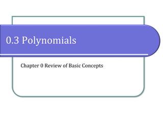 This document covers exponents, polynomials, and operations involving polynomials such as addition, subtraction, multiplication, and division. It defines polynomials and describes how they can be simplified using properties of exponents. It provides examples of multiplying and dividing polynomials using standard algorithms like distributing terms and cancelling out common factors. Special cases for multiplying binomials are also discussed.