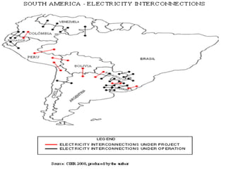 This document discusses energy integration in Latin America, including past experiences, the current status quo, and future perspectives. It analyzes the benefits of energy integration such as cost reductions, improved reliability, and increased energy trade. However, challenges remain such as developing harmonized long-term planning, legal frameworks, infrastructure, and new financing. If these challenges can be addressed, energy integration has the potential to stimulate regional cooperation, support sustainable development, and help meet growing energy demand in Latin America.