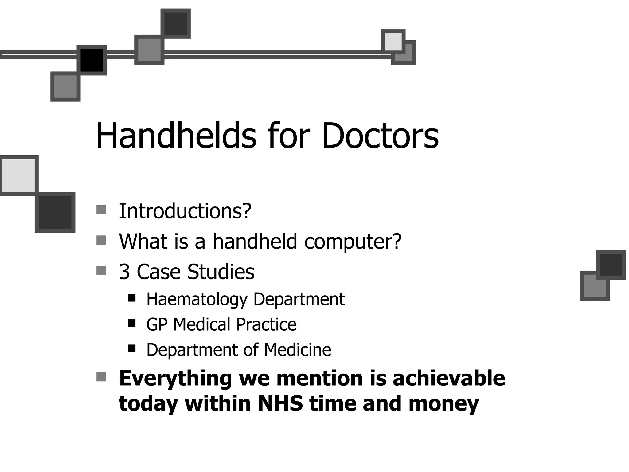 The document discusses the use of handheld computers by doctors and medical staff in various settings. It describes three case studies: a haematology department where handhelds helped coordinate patient care, a GP practice where they organized doctors' diaries and shared patient information, and a medical department where they improved continuity of care. The document promotes the benefits of handhelds for doctors, describing how they can be used for tasks like keeping addresses, patient records, to-do lists, and sharing protocols and recommends the website for more information on implementing similar projects.