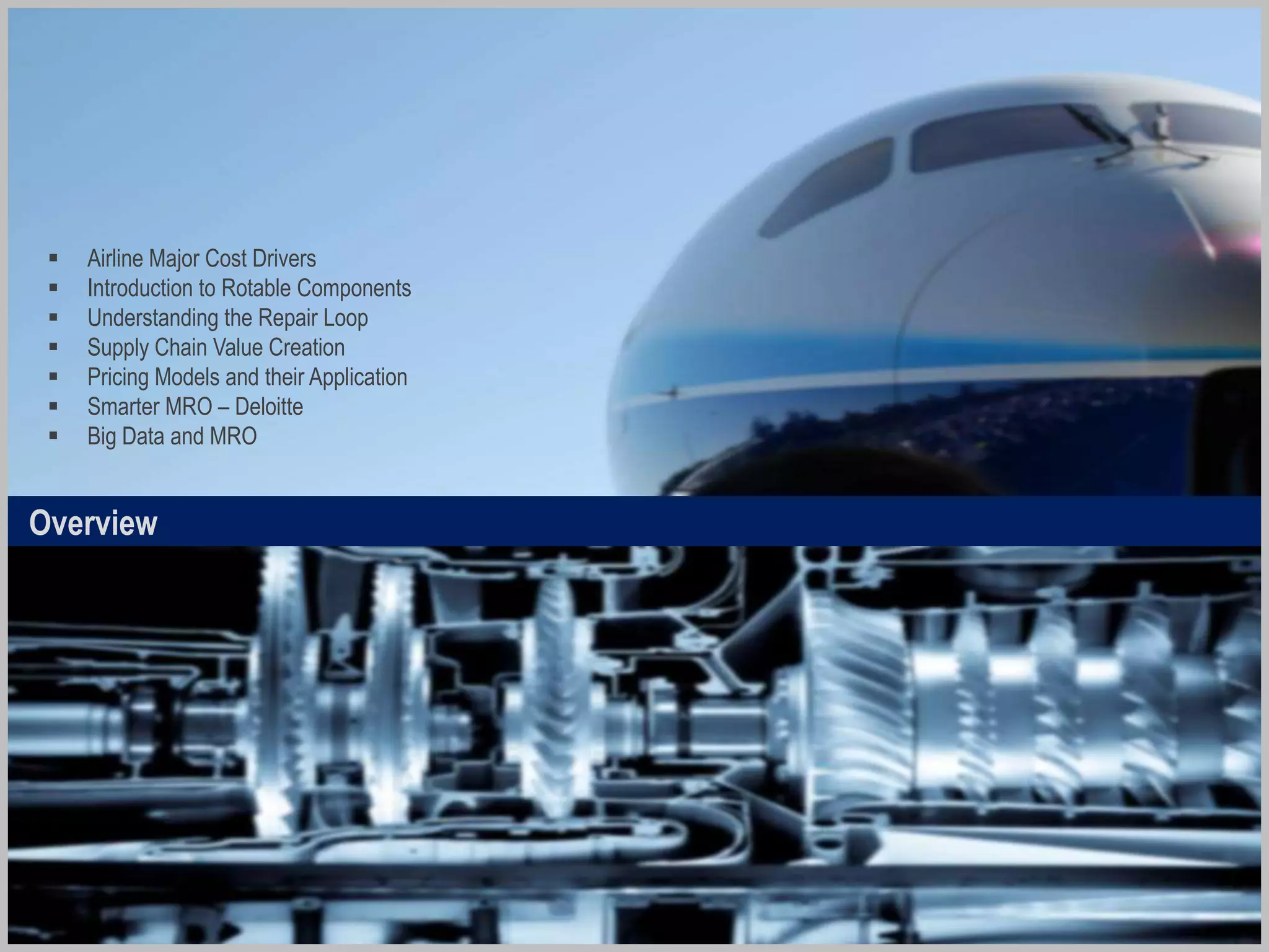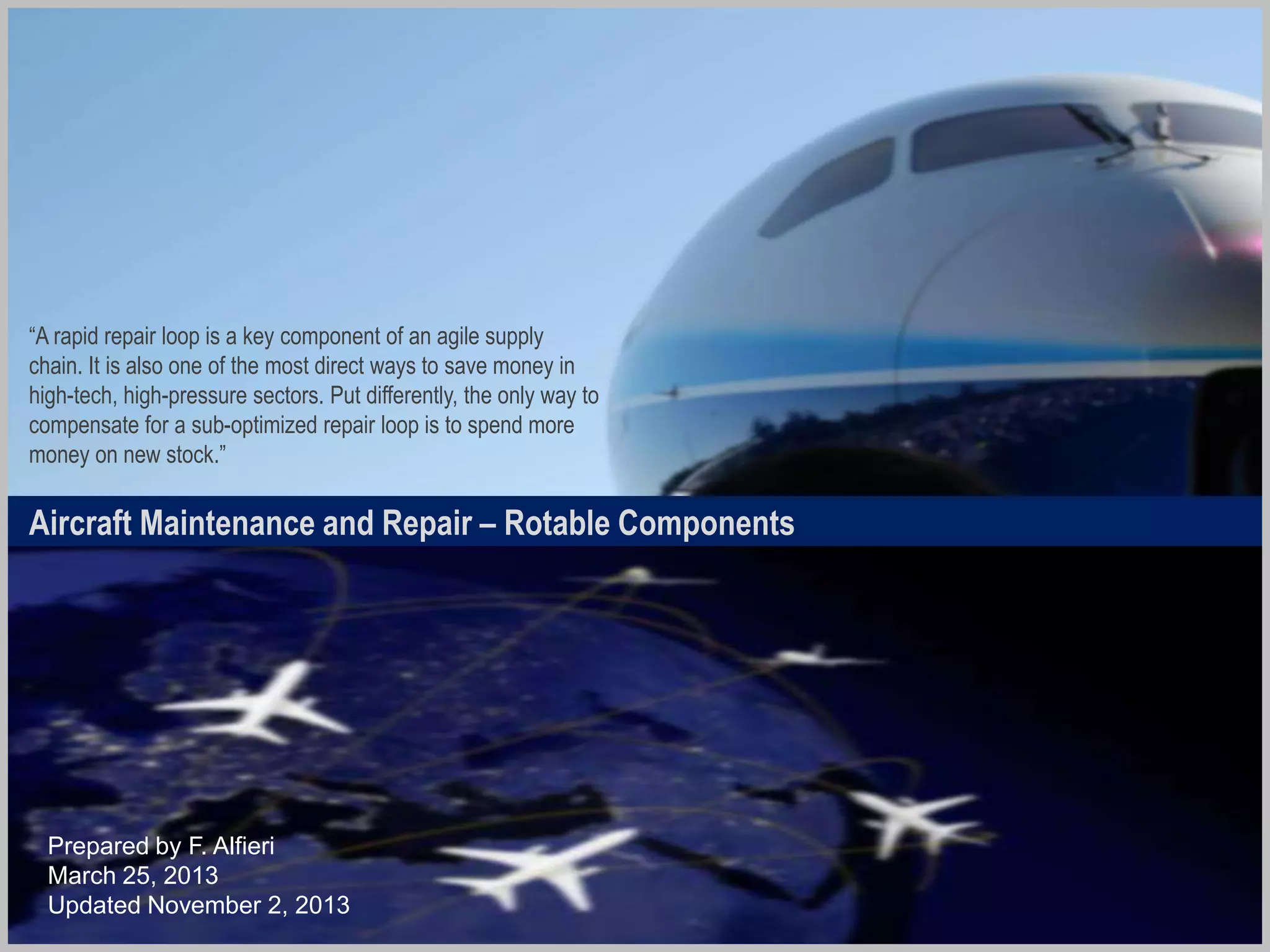 The document discusses the intricacies of aircraft maintenance, particularly focusing on the management of rotable inventory components and the optimization of the repair loop within the supply chain. It emphasizes the importance of a rapid repair loop for cost savings and efficient operations, while outlining the challenges posed by rising material costs and siloed processes. Furthermore, it details various pricing models and strategies for enhancing maintenance, repair, and operations (MRO) efficiency, leveraging data analytics and technology in the process.