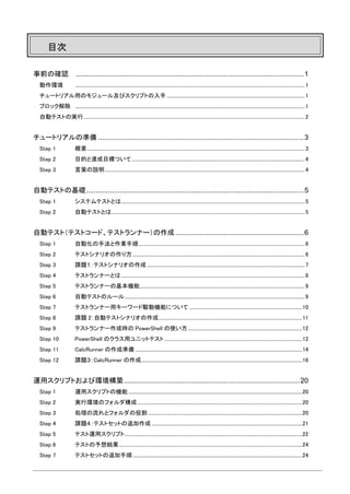 PowerShell の使い方 ① PowerShell のファイル種別 1. .ps1 実行可能なスクリプトファイル 2. .psm1 他のスクリプトから利用するスクリプトモジュールファイル 3. .psd1 スクリプトのマニフェストを記述したスクリプトマニフェストファイル ② TmpRunner を作成する場合のファイル構成 1. TmpRunner.psm1 Runner の本体 2. TmpRunner.psd1 Runner のマニフェストファイルで、Runner が必要とするモジュールを定義 3. TmpRunnerTest.ps1 Runner の単体テスト、実際のテスト実行時には使用しません 4. AutoTestSetUp.ps1 Runner の基本機能を提供するモジュール(dll)を読み込むスクリプトファイル ③ 注意点(Version 5.0.10586.117)2016/8/25 このバージョンの PowerShell ISE では、利用するクラスを変更してデバッグを行う場合、ISE の再立ち上 げが必要になります。(別プロセスで立ち上げでも回避可能です)再立ち上げを行わないと、利用クラスの 変更が反映されません。これは、修正前の利用クラスが動的にコンパイルされ、そのアセンブリが読み込ま れており、アセンブリの開放と再読み込みが行われないためです。 Step 10 PowerShell のクラス用ユニットテスト PowerShell のバージョン5以降では、独自クラスを定義することができるようになりました。このク ラスは、.NetFramework のクラスを継承することもできます。今回のテストランナー作成では、C#で 作成されたクラスを継承して、テストランナーを作成します。テストランナー用のユニットテストもテ スト専用のクラスを作成して行います。今回、PowerShell で作成した独自クラス用のユニットテスト フレームワークを利用します。 ① ユニットテストのフレームワーク(UnitTest.psm1)について 属性ベースのユニットテストフレームワークです。属性は、NUnit を参考にしています。 ユニットテストは、以下のようにテスト単位に SetUp と TearDown が呼び出されます。結果、テスト単位に初 期処理と終了処理が実行さます。 SetUp > テスト 1 > TearDown > SetUp > テスト 2 > TearDown ② ユニットテストで用意されている属性 1. SetUp 初期処理メソッドであることを示す属性です。 2. TearDown 終了処理メソッドであることを示す属性です。 3. Test テストメソッドであることを示す属性です。