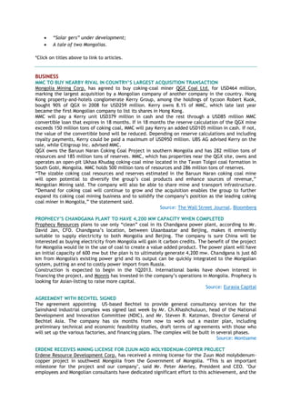 - Mongolia Mining Corp agreeing to acquire QGX Coal Ltd in the largest acquisition deal in Mongolia worth $464 million.