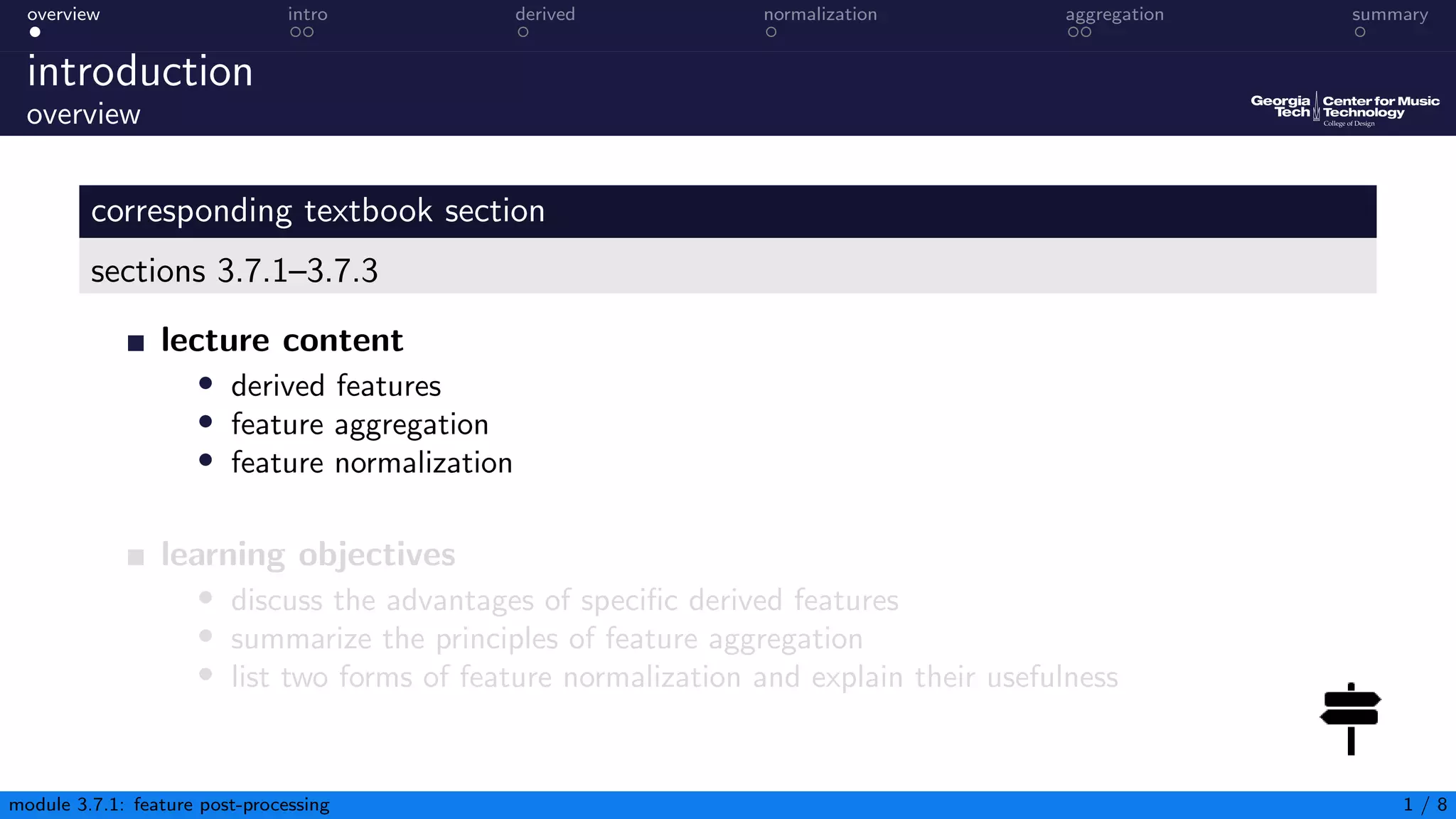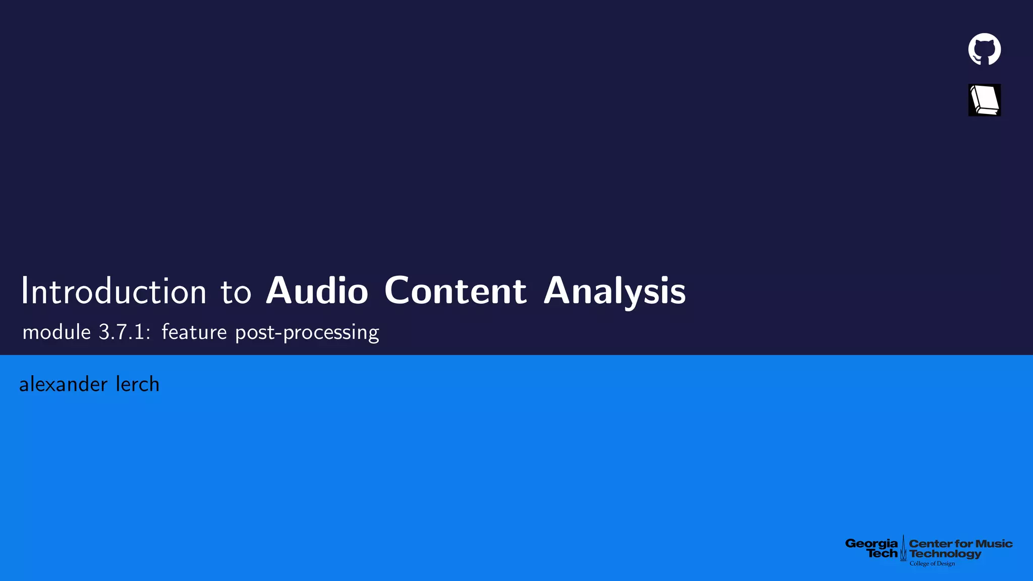 This document discusses post-processing of audio content features. It describes deriving additional features, aggregating features to reduce data and compute summary statistics, and normalizing features to ensure similar scales and distributions. Specific techniques include taking differences between adjacent values to derive new features, smoothing features using filters, computing z-score and min-max normalization, and aggregating features within blocks using statistical descriptors. The overall aim is to adapt the feature matrix to the task and classifier.