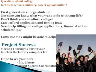The document provides announcements and information for students at Samuel Clemens High School. It includes notices about library closures, sports team accomplishments, important senior dates, college information resources, club meetings, fundraising opportunities, and more. The variety of notices are aimed at keeping students informed about school activities, events, and deadlines.