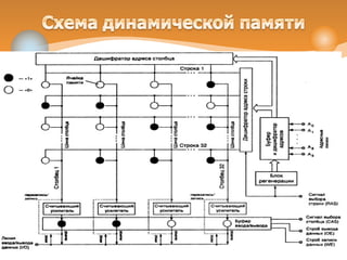 Документ описывает управление памятью в компьютерной системе, включая распределение ресурсов между пользовательскими процессами и компонентами операционной системы. Он также рассматривает различные типы памяти, такие как основная и вторичная, их архитектуру, временные характеристики доступа и способы регенерации данных. Важное внимание уделяется различным технологиям оперативной памяти, их производительности и совместимости с процессорами.