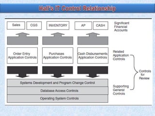 The document discusses two broad groupings of information systems control activities: general controls and application controls. General controls relate to many IS applications and support effective application controls by ensuring continued operation of IS. They include logical access controls, system development life cycle controls, program change management controls, and data center physical security controls. Application controls are designed to ensure complete and accurate processing of data from input through output and include controls over input, processing, and output of applications. The design of general controls depends on application control requirements and enterprise risk management, while reliance on application controls depends on the design and operating effectiveness of general controls.