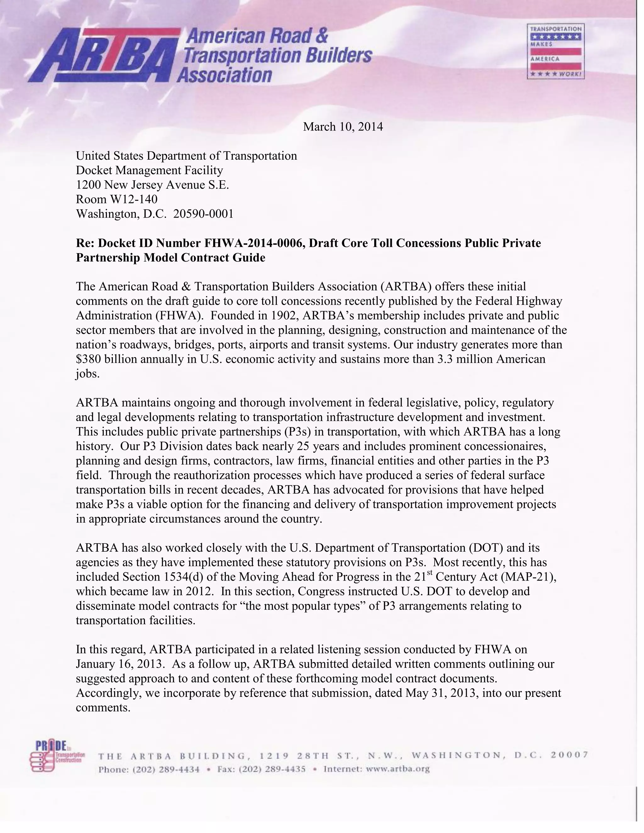 This document provides initial comments from the American Road & Transportation Builders Association (ARTBA) in response to the Federal Highway Administration's (FHWA) draft guide on core toll concessions public-private partnerships. ARTBA advocates that the guide should be educational rather than prescriptive given P3s rely on market efficiencies. ARTBA also suggests discussing performance bonding requirements and toll collection/enforcement responsibilities and mechanisms in more detail given their complexity in P3 projects. ARTBA incorporates prior detailed comments submitted in 2013 and offers to engage further with FHWA to refine the guide.