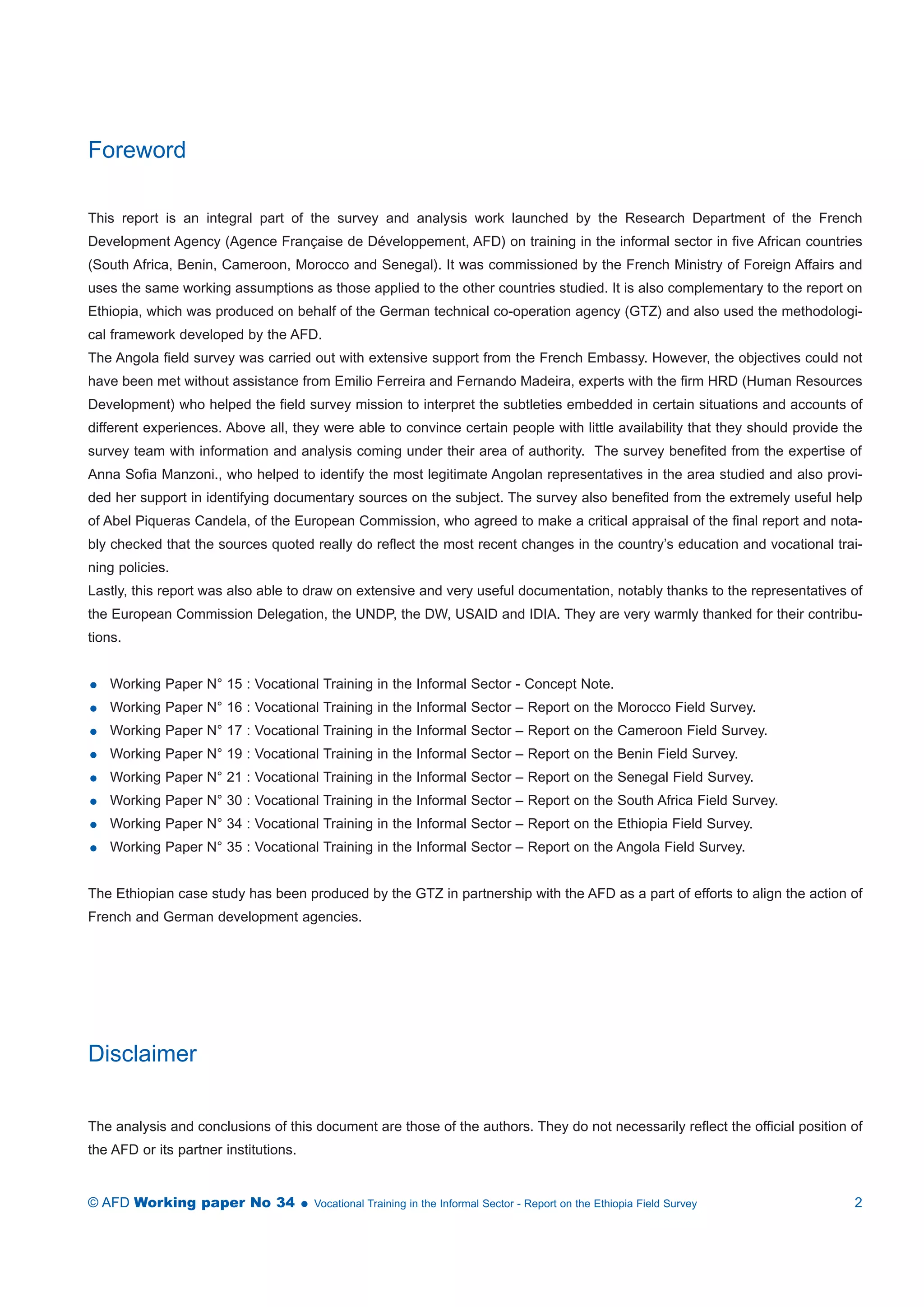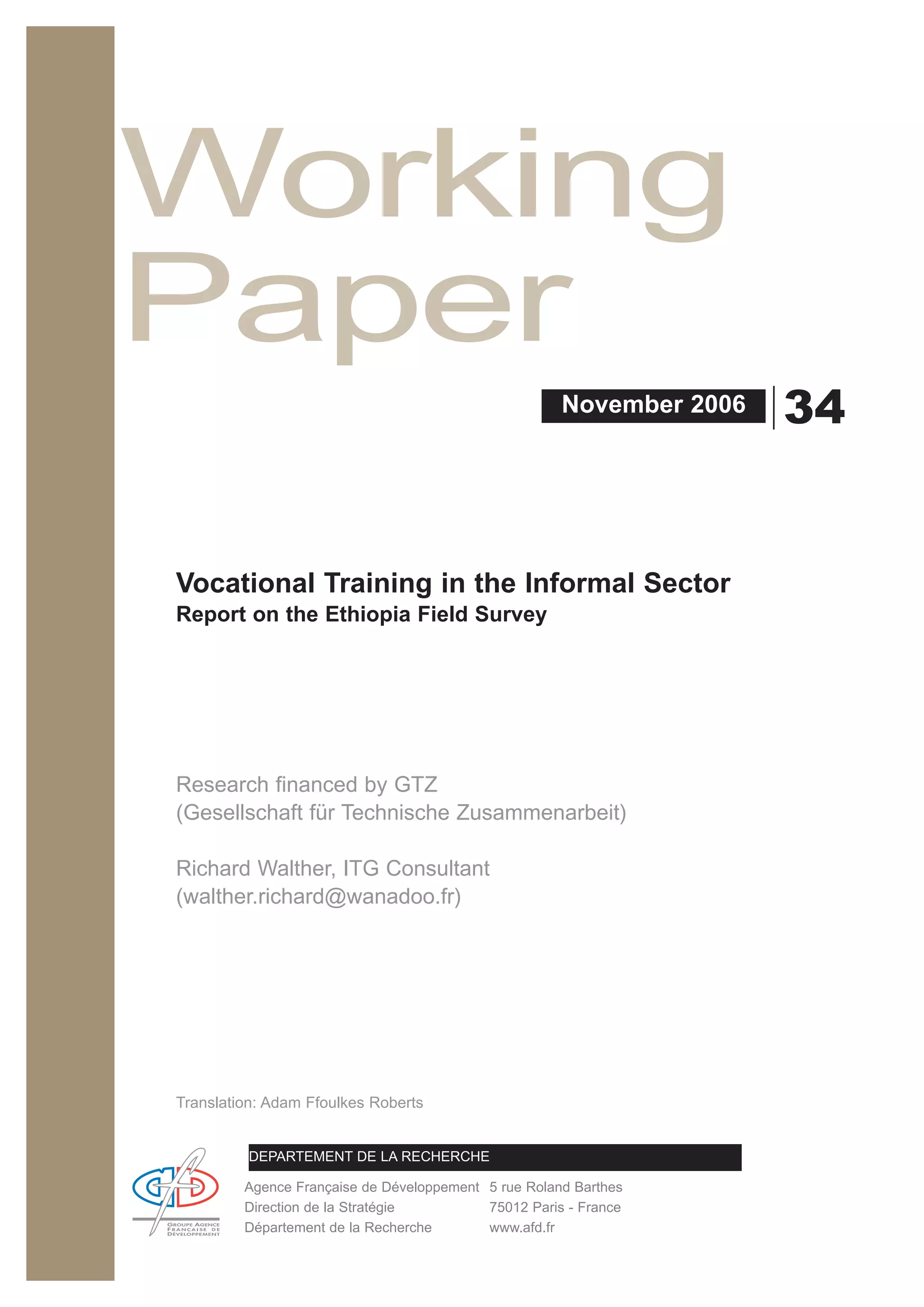The document summarizes a field survey report on vocational training in Ethiopia's informal sector. It notes that Ethiopia is undertaking an ambitious reform of its education and training system to better respond to economic needs and integrate formal, non-formal and informal training. However, fully including the informal sector is challenging as officials have differing views of its size and role. The reform aims to establish centers that recognize skills from various sources, but must first acknowledge realities of the informal economy and involve existing stakeholders to be effective. While the reform offers opportunities, its success requires focusing on developing what already exists in the informal sector rather than just pursuing its own training agenda.
