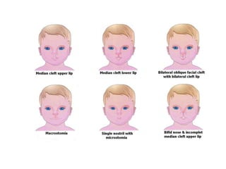 The development of the face occurs mainly between 5-8 weeks of gestation. The lower jaw forms first at 4 weeks, while facial proportions develop between 9 weeks to birth. During infancy and childhood, growth of teeth and sinuses further shapes the face. The five facial primordia - frontonasal, paired maxillary, and paired mandibular prominences - appear by 4 weeks and merge to form the lips, nose, and upper jaw. The nose, nasal cavities, and palate develop from these prominences between 4-12 weeks. Facial anomalies can result if the prominences fail to fuse properly, leading to cleft lips, cleft palates, or other clefts.