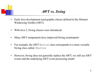This document provides an overview of the AWT and Swing toolkits in Java for building graphical user interfaces (GUIs). It describes the key classes in AWT like Component, Container, and Window. It also discusses limitations of AWT and how Swing addresses these by providing more versatile components that are rendered independently of the underlying platform. The document gives examples of common Swing components like buttons, text fields, lists, and how to add listeners and handle events.