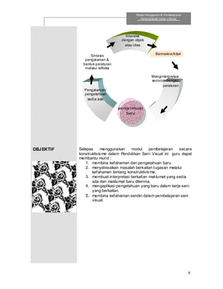Dokumen ini membahas tentang modul pengajaran pendidikan seni visual berdasarkan pendekatan konstruktivisme, di mana murid membina pengetahuan secara aktif berdasarkan pengalaman sedia ada. Metode ini mendorong murid untuk mencipta penyelesaian sendiri melalui interaksi, pemikiran kritis, dan dialog dengan guru dan rakan sebaya. Dengan penerapan strategi ini, diharapkan murid dapat mengembangkan kefahaman mendalam dan kemahiran sosial dalam seni visual.