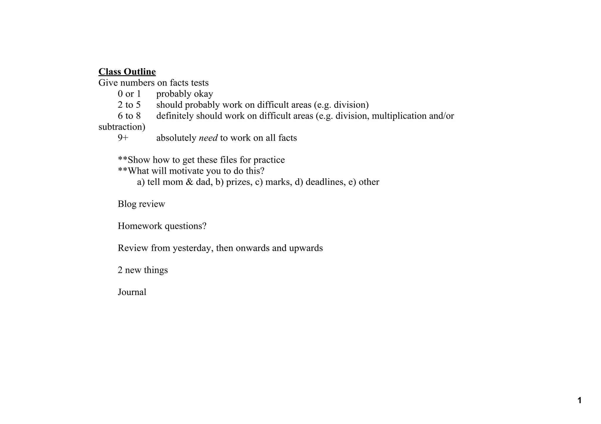 1. The class outline discusses different number ranges for facts tests, suggesting levels of practice needed based on scores, and reviews homework questions and material from previous lessons.
