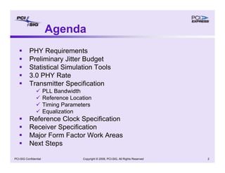 The document discusses requirements for the PCI Express 3.0 physical layer. It summarizes simulation results showing that 8 GT/s is feasible for target client and server channels with reasonable equalization, while 10 GT/s imposes a higher power penalty. It provides details on transmitter and receiver specifications, jitter budgets, and channel models used in simulations to evaluate maximum data rates. Key considerations for the PCIe 3.0 specification include transmitter parameters, receiver equalization techniques, and backwards compatibility.