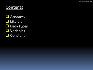 PHP scripts contain PHP code interspersed with HTML. PHP code is contained within opening <?php and closing ?> tags and is interpreted by the Zend engine before the page is sent to the browser. There are different styles of PHP tags like XML, short open, script, and ASP styles. PHP supports core data types like integers, floats, strings, booleans and other special types. Variables in PHP begin with a $ sign and have a name, value, and type. Constants are values that cannot change during script execution and are defined using the define() function.