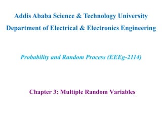 Chapter 3 of the document discusses multiple random variables and their statistical properties, including joint cumulative distribution functions, probability density functions, and the independence of random variables. It provides examples and methods for calculating the probability density function of sums of random variables and explores various scenarios involving independence and convolution. The chapter emphasizes the importance of understanding these concepts for practical applications, such as receiver design in communication systems.