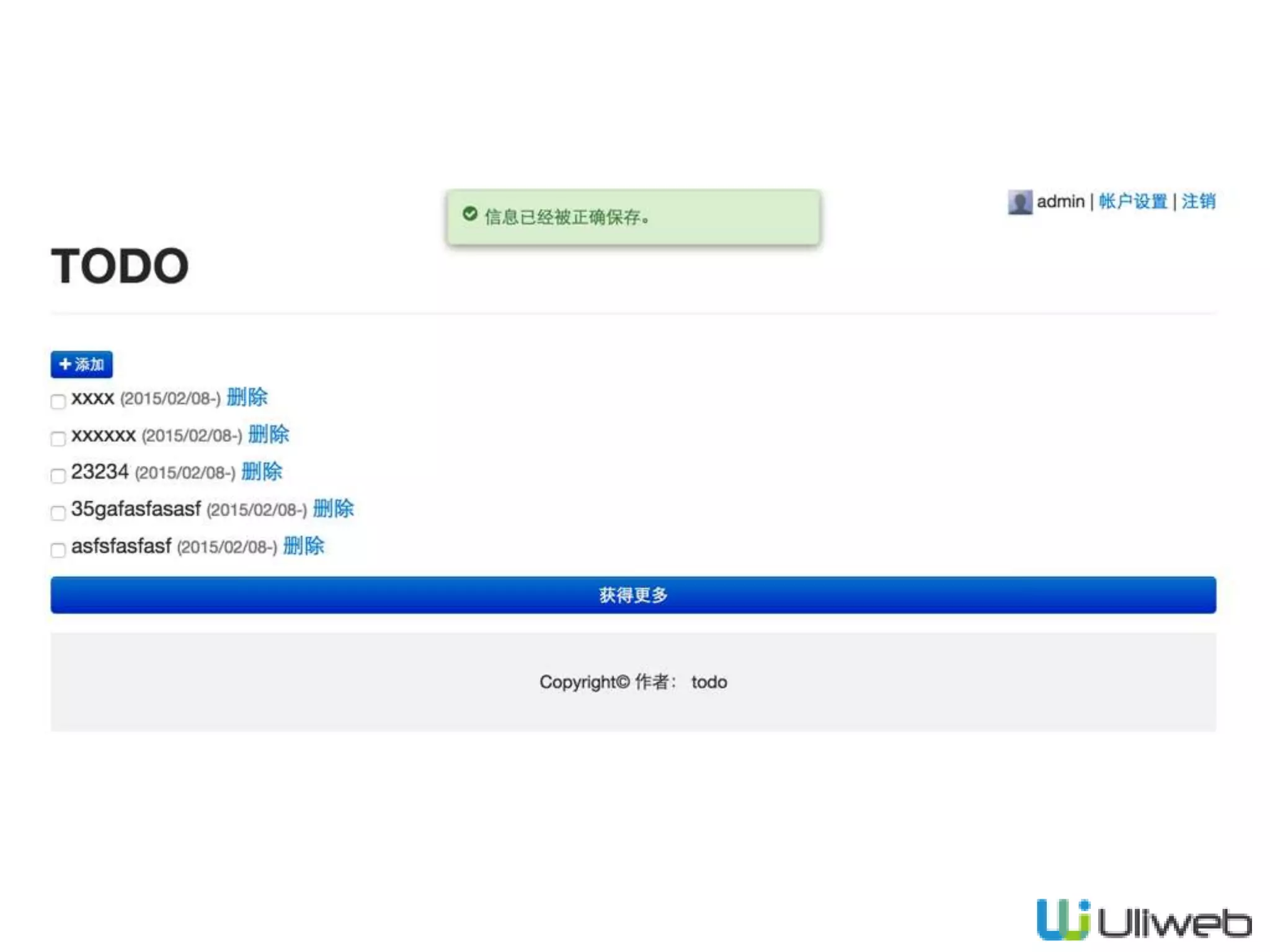 class="tools"> <a href='/todo1/add' class="btn btn-success btn-mini"> <i class="icon icon-plus"></i> 添加</a> </div> <ul class="unstyled" id="todos"> </ul> <a href="#" class="btn btn-block btn-primary" id="btnNext" style="display:none;">获得更多</a> </div> <div class="container footer"> Copyright© 作者: {{=settings.TODO.auth}} </div> bootstrap布局 准备使用ajax方式处理 更多分页处理 font-awesome图标