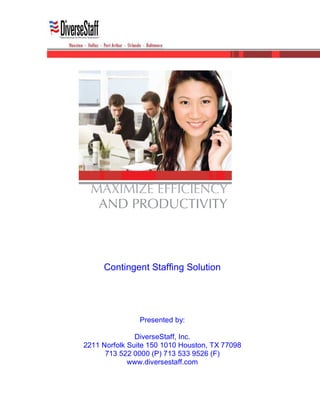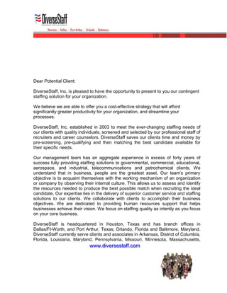 DiverseStaff, Inc. is a minority woman-owned staffing organization that provides contingent staffing solutions and other human resources services. They offer temporary and direct placement of diverse candidates, including clerical, industrial, professional and technical positions. DiverseStaff has over 40 clients across 11 states and aims to develop long-term partnerships with clients through superior customer service and staffing solutions.