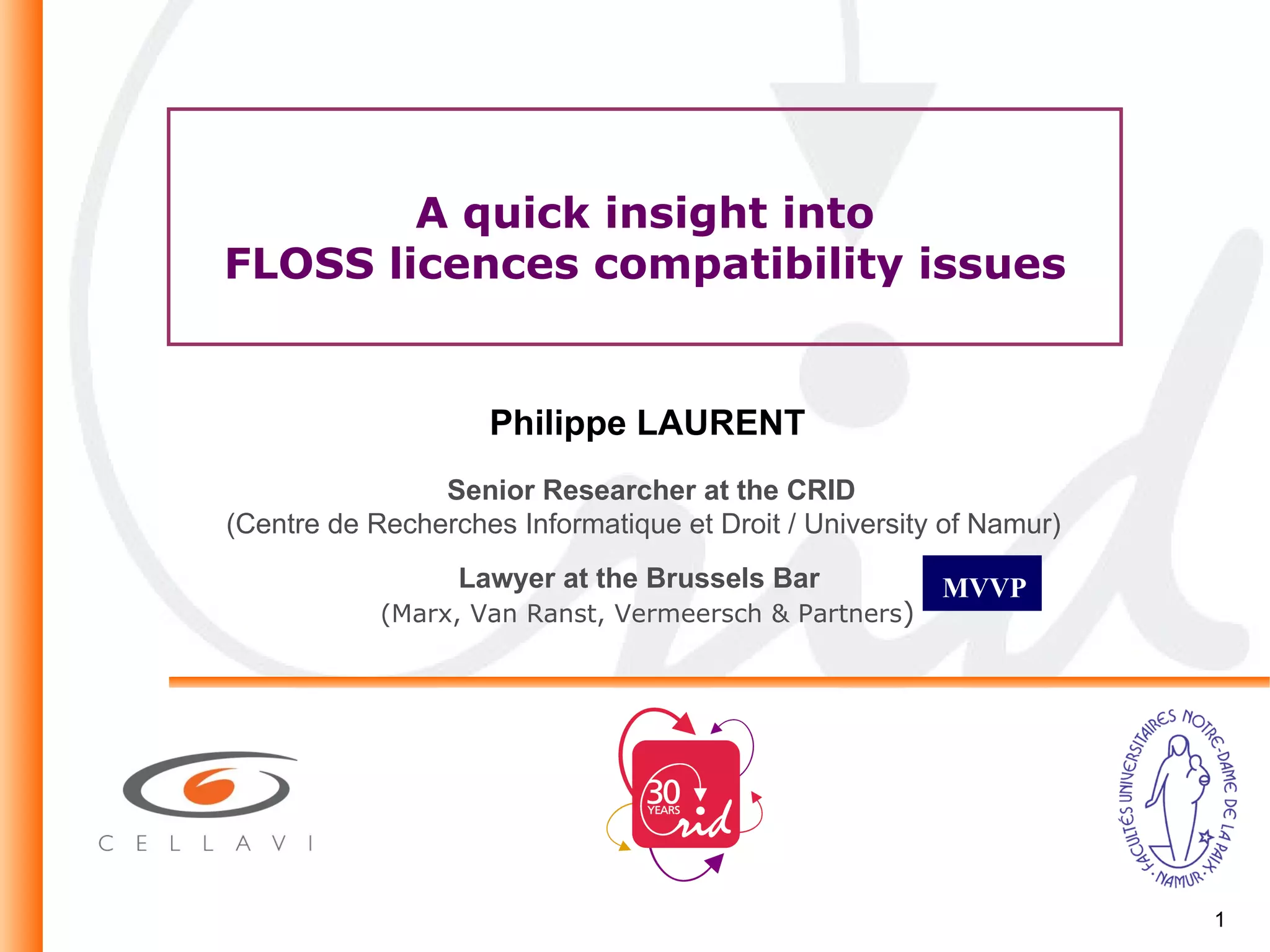 Compatibility of free and open source software (FLOSS) licenses refers to whether code distributed under different licenses can be combined. Strict compatibility is one-way, as GPL code cannot be added to BSD code, though BSD code can be added to GPL. Copyleft licenses like GPL have predominant effect, making other licenses incompatible. Newer licenses like GPLv3 and EUPL include clauses to improve compatibility, such as allowing additional permissions or defining compatible licenses. Compatibility issues must be considered before and during development to allow code reuse and acceptability.