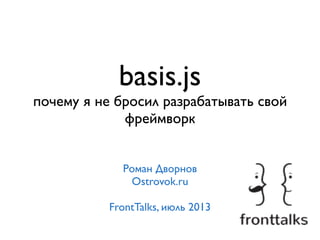 Документ представляет собой презентацию о фреймворке basis.js, который был разработан Романом Дворновым для создания одностраничных приложений. В презентации освещаются ключевые особенности framework'а, такие как модульность, работа с данными и поддержка адаптивности интерфейсов. Также обсуждаются сравнительные характеристики с другими фреймворками, способами оптимизации и инструментами для разработки.