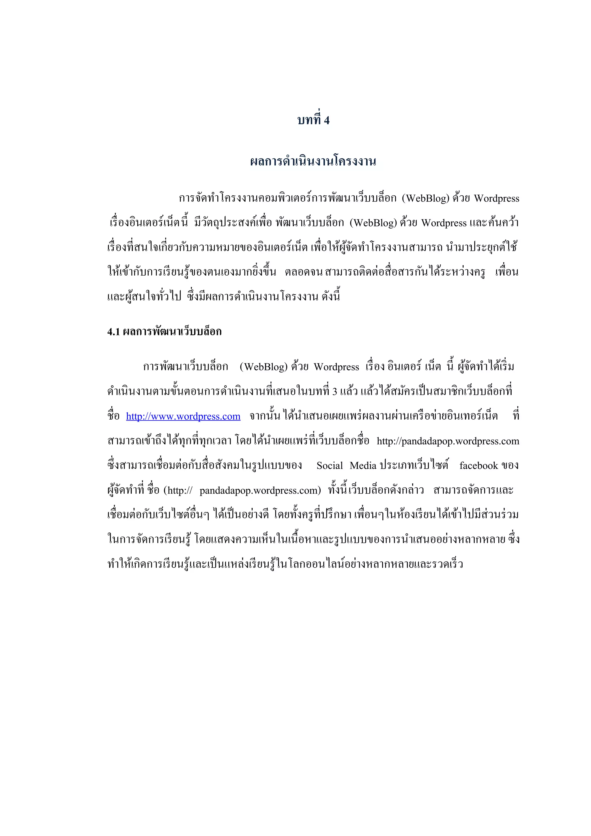 ผลการดาเนินงานโครงงาน การจัดทาโครงงานคอมพิวเตอร์การพัฒนาเว็บบล็อก (WebBlog) ด้วย Wordpress เรื่ องอินเตอร์เน็ต นี้ มีวตถุประสงค์เพื่อ พัฒนาเว็บบล็อก (WebBlog) ด้วย Wordpress และค้นคว้า ั เรื่ องที่สนใจเกี่ยวกับความหมายของอินเตอร์เน็ต เพื่อให้ผจดทาโครงงานสามารถ นามาประยุกต์ใช้ ู้ ั ให้เข้ากับการเรี ยนรู้ของตนเองมากยิงขึ้น ตลอดจนสามารถติดต่อสื่อสารกันได้ระหว่างครู เพื่อน ่ และผูสนใจทัวไป ซึ่งมีผลการดาเนินงานโครงงาน ดังนี้ ้ ่ 4.1 ผลการพัฒนาเว็บบล็อก การพัฒนาเว็บบล็อก (WebBlog) ด้วย Wordpress เรื่ อง อินเตอร์ เน็ต นี้ ผูจดทาได้เริ่ ม ้ั ดาเนินงานตามขั้นตอนการดาเนินงานที่เสนอในบทที่ 3 แล้ว แล้วได้สมัครเป็ นสมาชิกเว็บบล็อกที่ ชื่อ http://www.wordpress.com จากนั้น ได้นาเสนอเผยแพร่ ผลงานผ่านเครื อข่ายอินเทอร์เน็ต ที่ สามารถเข้าถึงได้ทุกที่ทุกเวลา โดยได้นาเผยแพร่ ที่เว็บบล็อกชื่อ http://pandadapop.wordpress.com ซึ่งสามารถเชื่อมต่อกับสื่อสังคมในรู ปแบบของ Social Media ประเภทเว็บไซต์ facebook ของ ผูจดทาที่ ชื่อ (http:// pandadapop.wordpress.com) ทั้งนี้ เว็บบล็อกดังกล่าว สามารถจัดการและ ้ั เชื่อมต่อกับเว็บไซต์อื่นๆ ได้เป็ นอย่างดี โดยทั้งครู ที่ปรึ กษา เพื่อนๆในห้องเรี ยนได้เข้าไปมีส่วนร่ วม ในการจัดการเรี ยนรู้ โดยแสดงความเห็นในเนื้อหาและรู ปแบบของการนาเสนออย่างหลากหลาย ซึ่ง ทาให้เกิดการเรี ยนรู้และเป็ นแหล่งเรี ยนรู้ในโลกออนไลน์อย่างหลากหลายและรวดเร็ ว