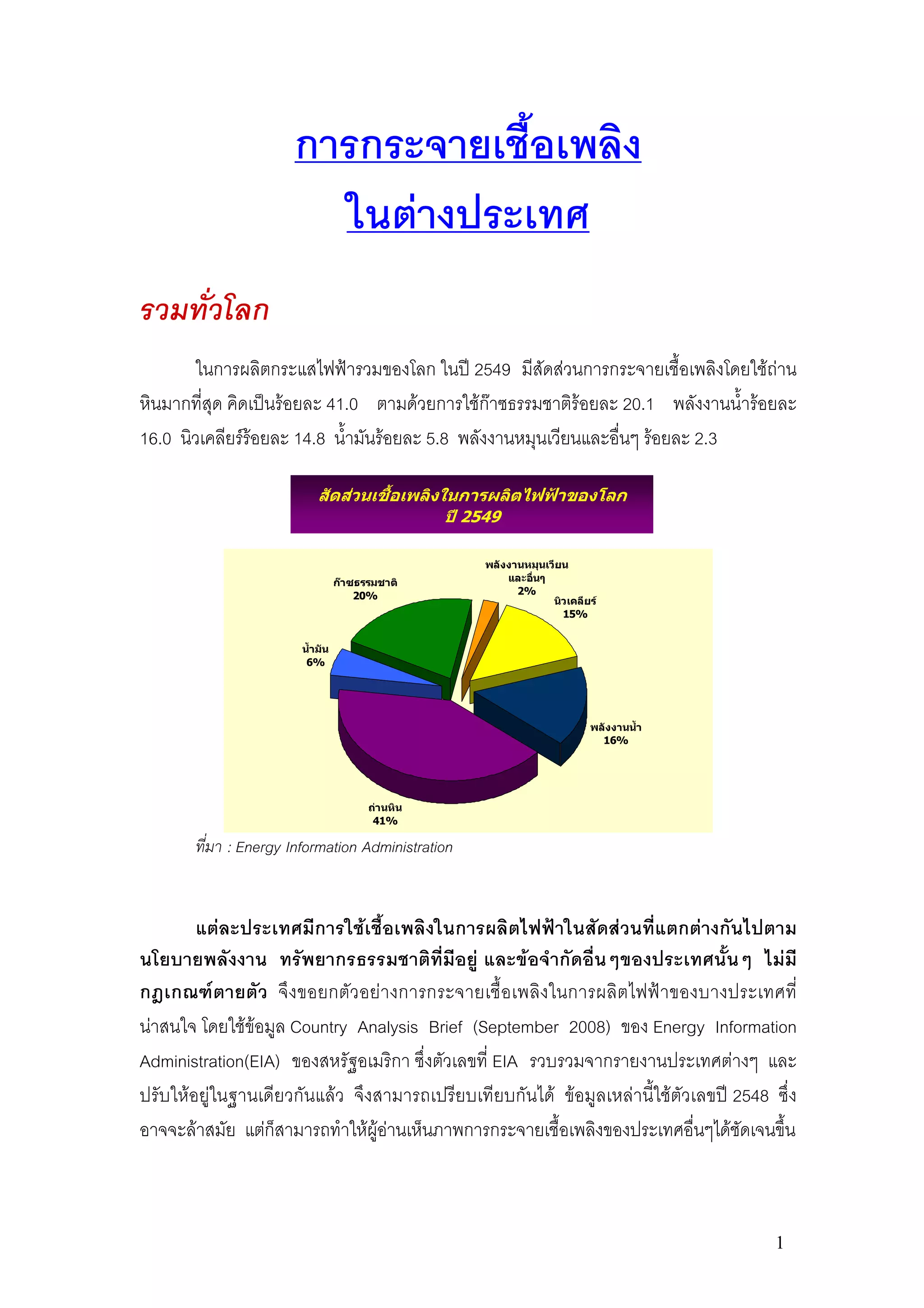 ในตางประเทศ รวมทั่วโลก ในการผลิตกระแสไฟฟารวมของโลก ในป 2549 มีสัดสวนการกระจายเชื้อเพลิงโดยใชถาน หินมากที่สุด คิดเปนรอยละ 41.0 ตามดวยการใชกาซธรรมชาติรอยละ 20.1 พลังงานน้ํารอยละ 16.0 นิวเคลียรรอยละ 14.8 น้ํามันรอยละ 5.8 พลังงานหมุนเวียนและอื่นๆ รอยละ 2.3 สัดสวนเชื้อเพลิงในการผลิตไฟฟาของโลก ป 2549 พลังงานหมุนเวียน กาซธรรมชาติ และอื่นๆ 20% 2% นิวเคลียร 15% น้ํามัน 6% พลังงานน้ํา 16% ถานหิน 41% ที่มา : Energy Information Administration แตละประเทศมีการใชเชื้อเพลิงในการผลิตไฟฟาในสัดสวนที่แตกตางกันไปตาม นโยบายพลังงาน ทรัพยากรธรรมชาติที่มีอยู และขอจํากัดอื่นๆของประเทศนั้นๆ ไมมี กฎเกณฑ ตายตัว จึงขอยกตัว อยา งการกระจายเชื้อเพลิงในการผลิตไฟฟ าของบางประเทศที่ นาสนใจ โดยใชขอมูล Country Analysis Brief (September 2008) ของ Energy Information Administration(EIA) ของสหรัฐอเมริกา ซึ่งตัวเลขที่ EIA รวบรวมจากรายงานประเทศตางๆ และ ปรับใหอยูในฐานเดียวกันแลว จึงสามารถเปรียบเทียบกันได ขอมูลเหลานี้ใชตัวเลขป 2548 ซึ่ง อาจจะลาสมัย แตก็สามารถทําใหผูอานเห็นภาพการกระจายเชื้อเพลิงของประเทศอื่นๆไดชัดเจนขึ้น 1