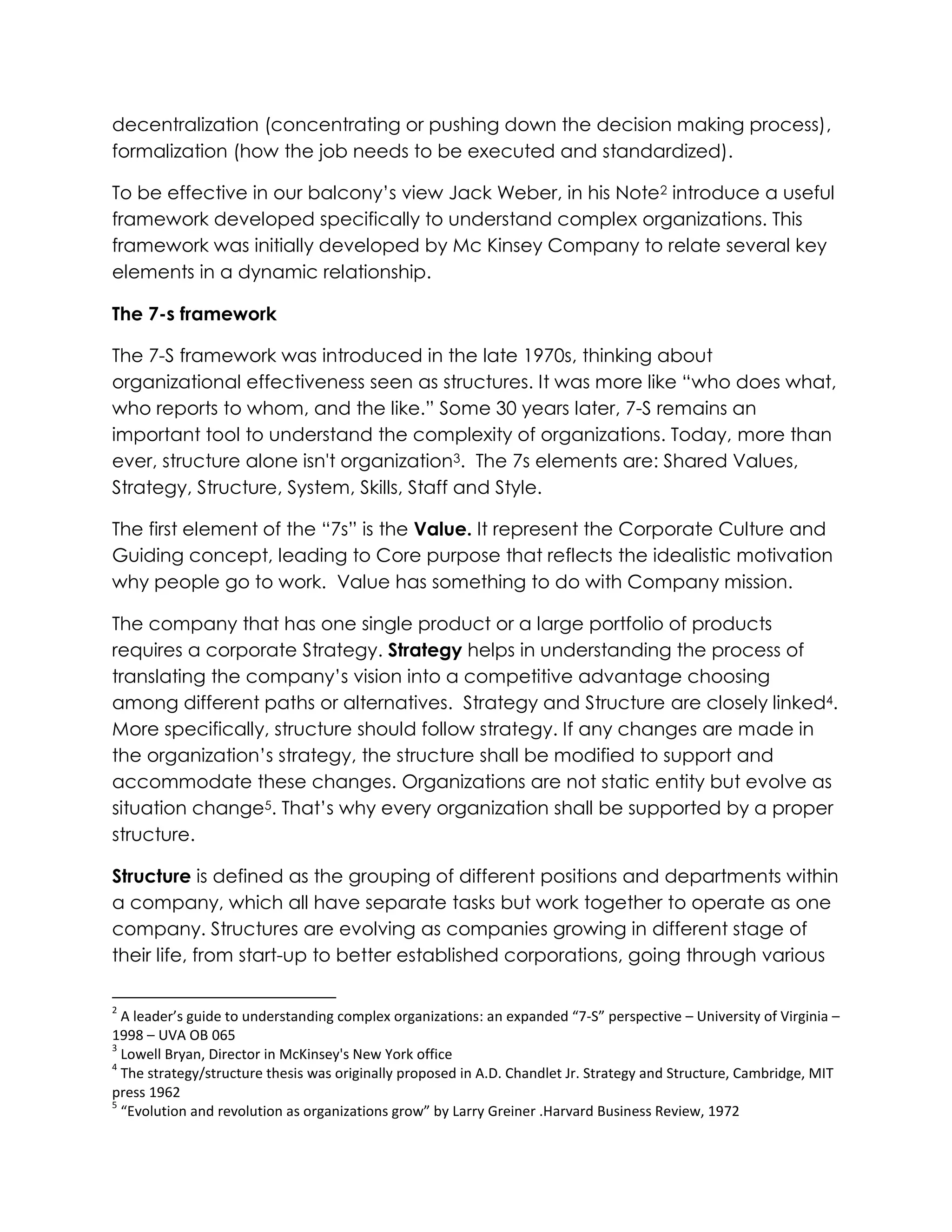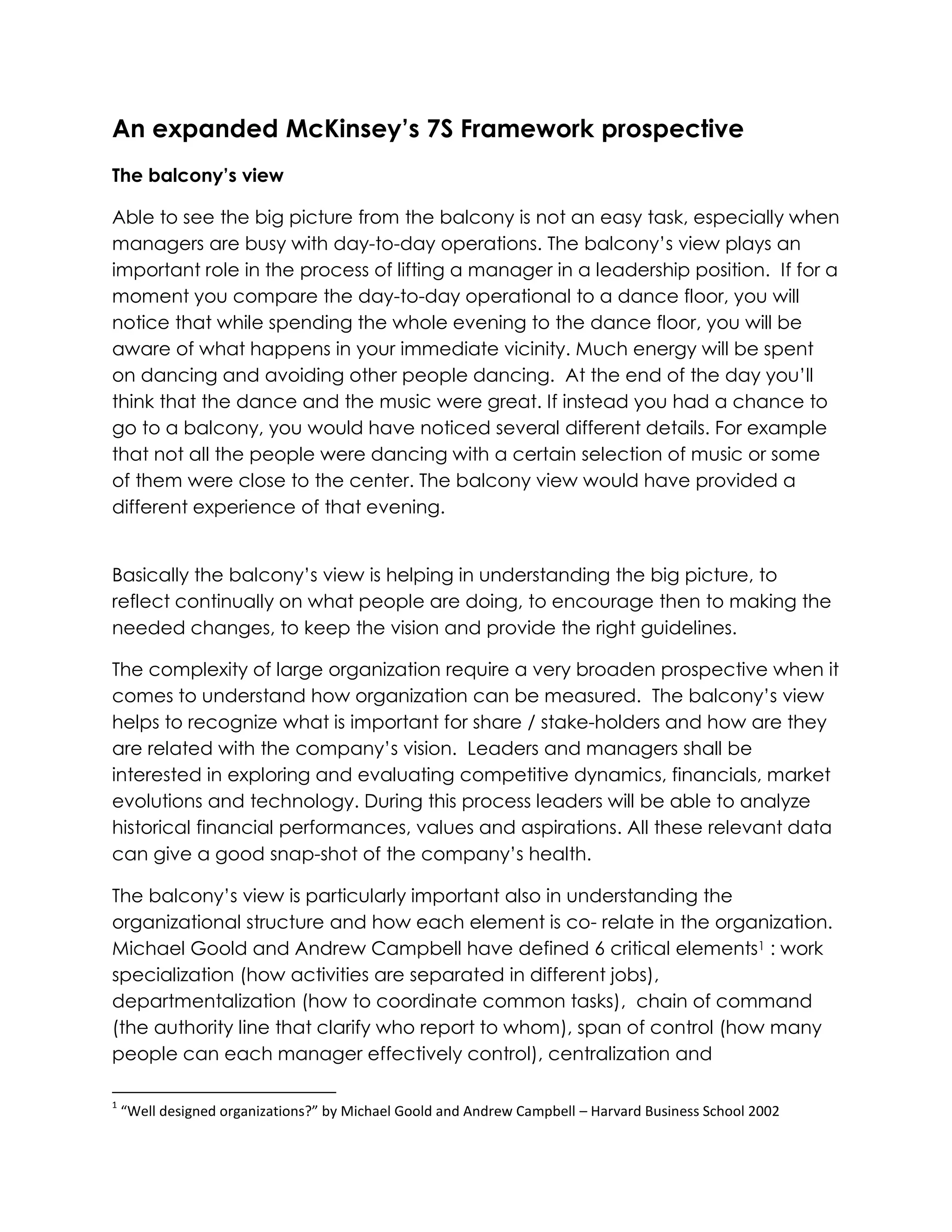 The document discusses an expanded perspective on McKinsey's 7S framework, emphasizing the importance of a 'balcony view' for managers to understand the bigger picture beyond daily operations. It outlines the six critical elements of organizational structure and the essential components of the 7S framework—shared values, strategy, structure, systems, skills, and style—highlighting how they interrelate to assess and implement organizational effectiveness. The conclusion suggests that while the 7S framework is a valuable tool for managing change, it may lack consideration of psychological factors, and recommends additional models for strategic assessment.