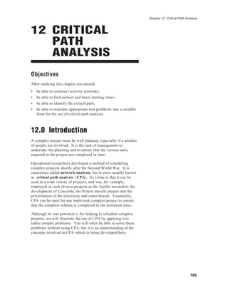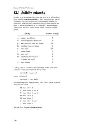 This document discusses critical path analysis (CPA), which is a method for scheduling complex projects. CPA involves constructing an activity network that shows the tasks, durations, and dependencies. The network is used to calculate the earliest and latest start times for each task to identify the critical path - the sequence of tasks that determines the minimum project duration. The document provides an example of using CPA to plan the construction of a garage, constructing the network and determining the critical path. It also outlines the algorithm for systematically constructing activity networks.