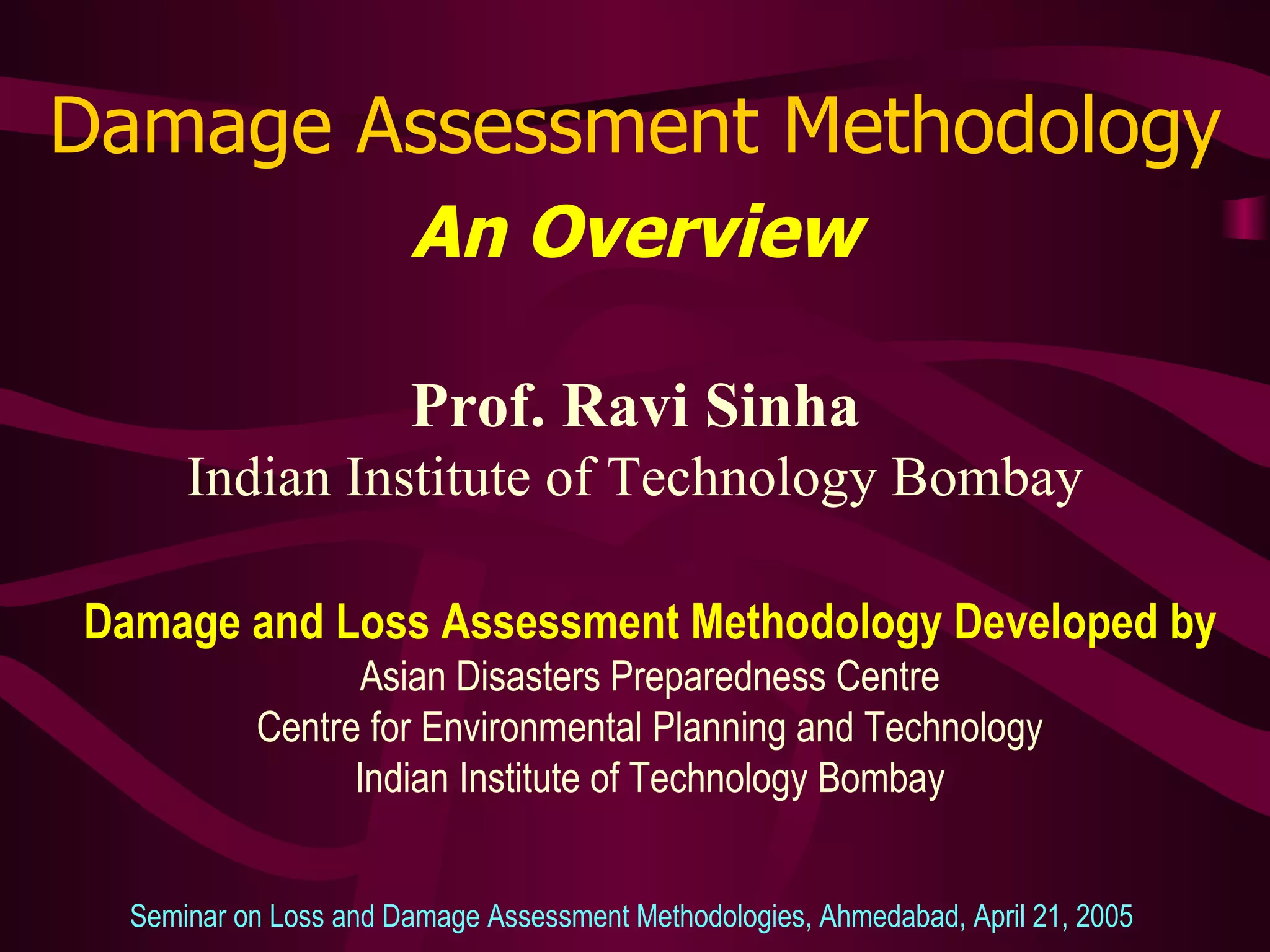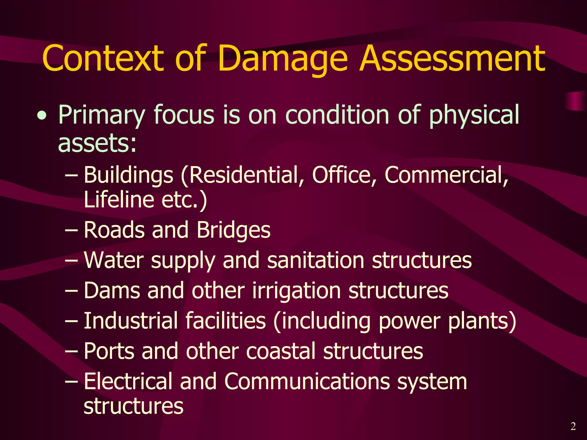 The document provides an overview of damage assessment methodology for various structures after a disaster. It discusses that damage assessment has short, medium and long-term objectives. For buildings, it proposes a three step methodology for damage assessment including rapid safety assessment, detailed safety assessment, and engineering evaluation. Similar methodologies are discussed for assessing damage to other structures like bridges, roads, reservoirs, irrigation structures and more.