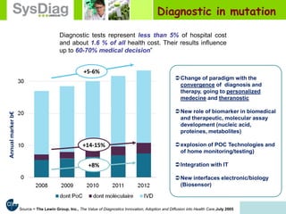 The document discusses the collaboration between public and private sectors to enhance open innovation in diagnostic medicine, highlighting the shift towards personalized medicine and the increasing importance of biomarkers. It outlines the Sysdiag model's focus on chronic diseases, interdisciplinary innovation, and fostering networks to support R&D in diagnostics. Additionally, it emphasizes the need for patient-centered strategies and the integration of technology in healthcare to reshape market practices and improve clinical decision-making.