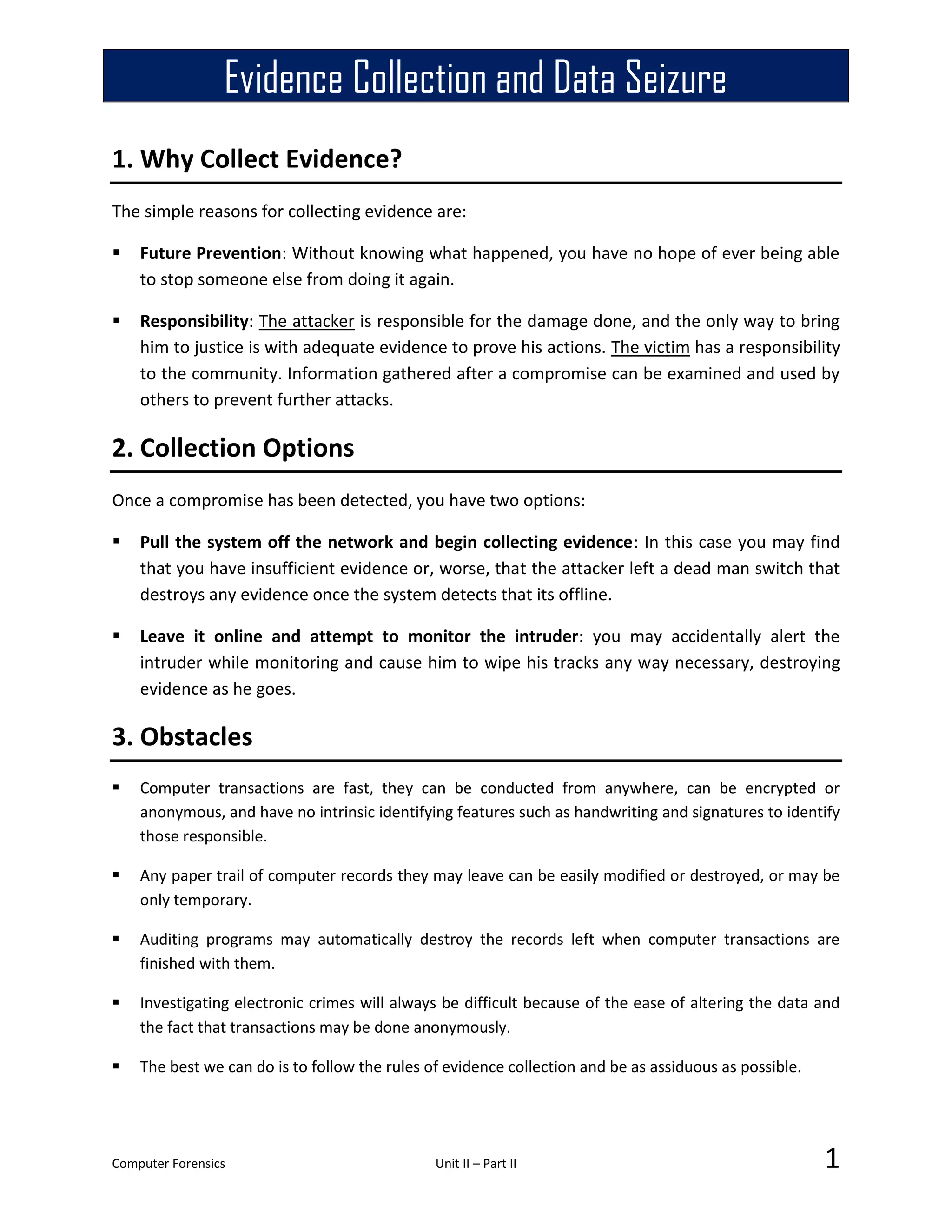 The document discusses guidelines for properly collecting and analyzing digital evidence from compromised systems. It emphasizes the importance of preserving evidence in its original state, establishing a clear chain of custody, and thoroughly documenting all procedures to ensure the evidence is admissible in court. The general procedure involves identifying relevant evidence, analyzing it to reconstruct the incident, and presenting findings in an understandable way. Volatile data like memory contents should be captured before non-volatile data from disks. Contamination must be avoided by only examining copies of original data.