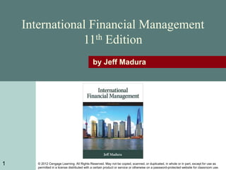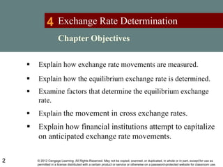 The document discusses exchange rate determination and factors that influence exchange rates. It begins by explaining how exchange rate movements are measured and how the equilibrium exchange rate is determined by the interaction of supply and demand. Key factors that can cause fluctuations in exchange rates are then examined, such as relative inflation, interest rates, income levels, and expectations of future economic conditions between countries. Speculators seek to capitalize on anticipated exchange rate movements through currency speculation.