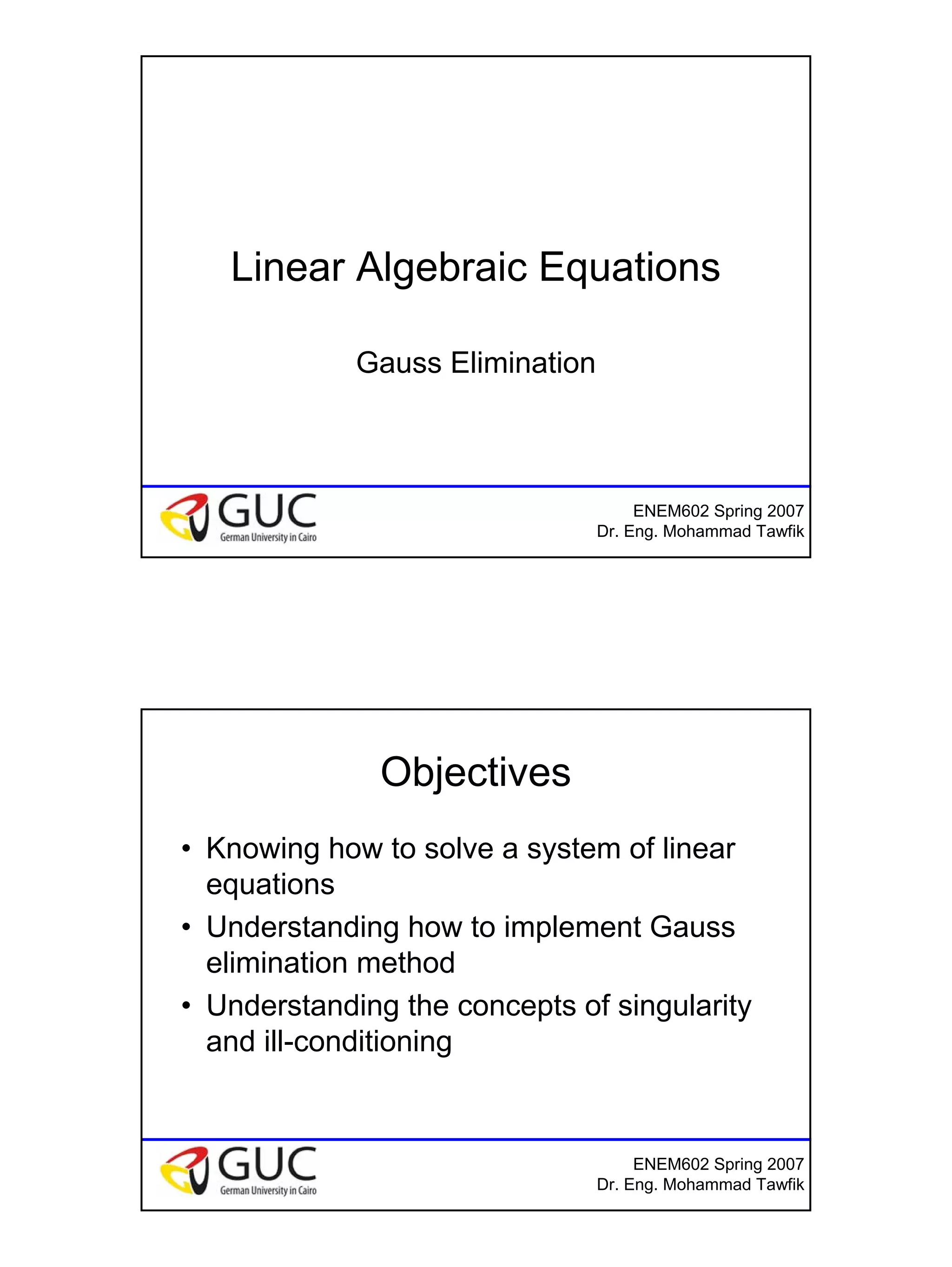 This document discusses iterative methods for solving systems of linear equations. It introduces the Gauss-Jacobi and Gauss-Seidel methods. For Gauss-Jacobi, each new approximation is calculated from the previous approximations. For Gauss-Seidel, the most recent approximation is used. The document provides examples of applying each method and discusses conditions for convergence. As homework, students are asked to use the two methods to approximate solutions for a given system of equations.