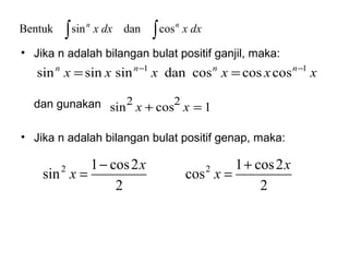 Dokumen ini membincangkan integrasi trigonometri, khususnya cara mengintegrasi fungsi seperti ∫ sin n x dx dan ∫ cos n x dx berdasarkan sama ada n adalah ganjil atau genap. Ia menerangkan penggunaan identiti trigonometri untuk menyederhanakan fungsi dan memberikan pelbagai contoh pengiraan. Terdapat juga perbincangan mengenai bentuk yang melibatkan tan dan cot dalam integrasi.