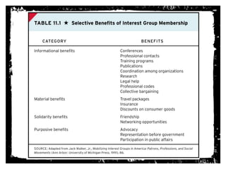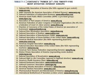 This document discusses interest groups and their role in American democracy. It defines interest groups as organizations that work to influence government policies and programs on issues that are important to their members. While interest groups can promote political participation and representation, not all interests are equally represented. The document also describes different types of interest groups, how they attract members, and the strategies they use to influence government, such as lobbying elected officials directly or mobilizing public support for their issues.