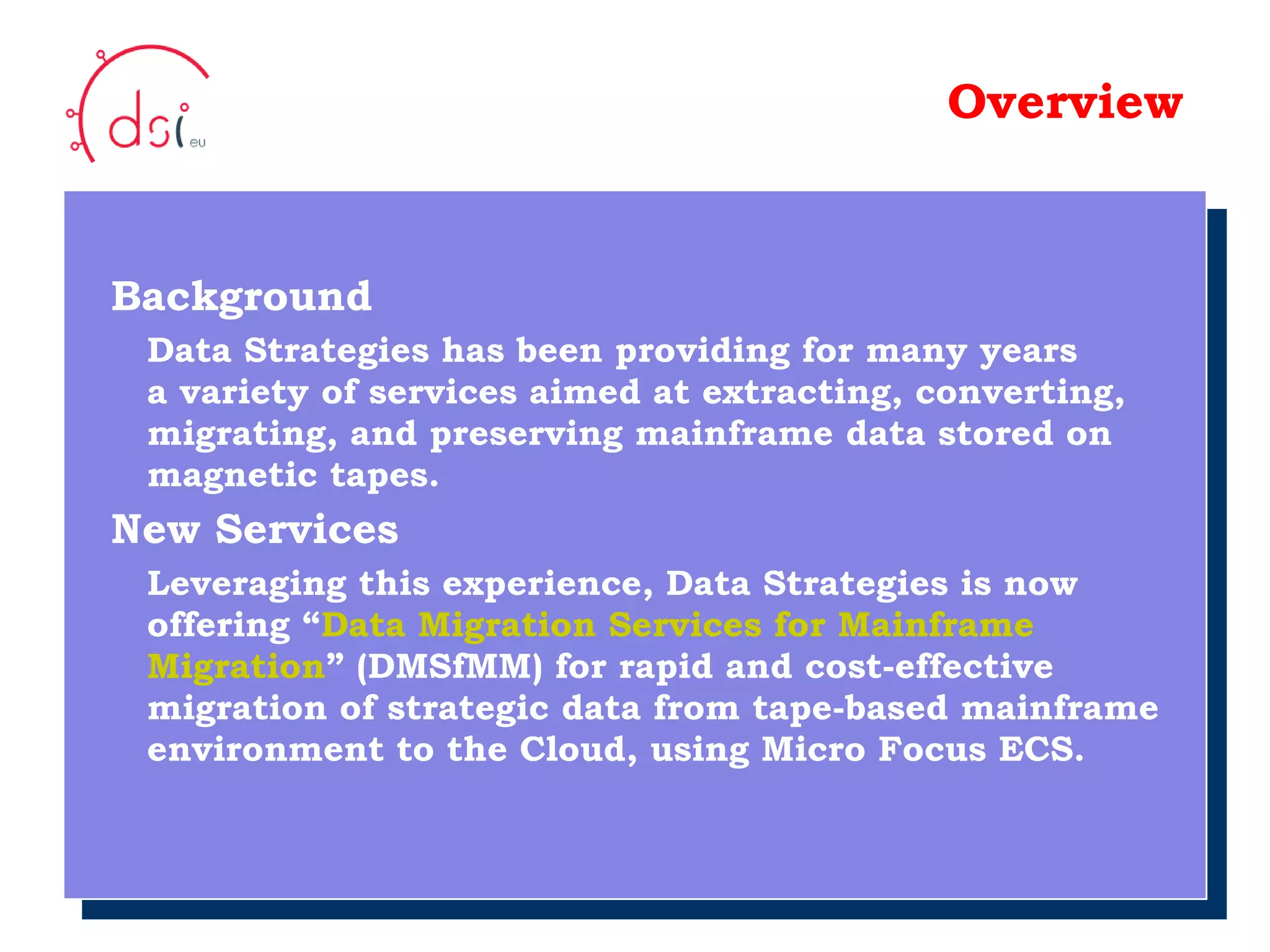 Data Strategies is offering data migration services for mainframe data stored on tape, aimed at rapid and cost-effective transition to the cloud. They address the challenge of migrating large amounts of unstructured data, significantly reducing the volume of data to be migrated by leveraging analysis and virtualization techniques. Their process includes consolidating control metadata and allows for flexible access to migrated data in the cloud.