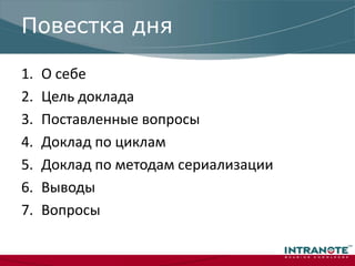 Доклад обсуждает эффективность различных циклов и методов сериализации в .NET, акцентируя внимание на производительности перебора массивов. Приведенные данные показывают, что для небольших массивов лучше использовать 'foreach', а для больших - 'for'. Также рассматриваются аспекты сериализации, её скорость и выбор библиотек для работы с данными.