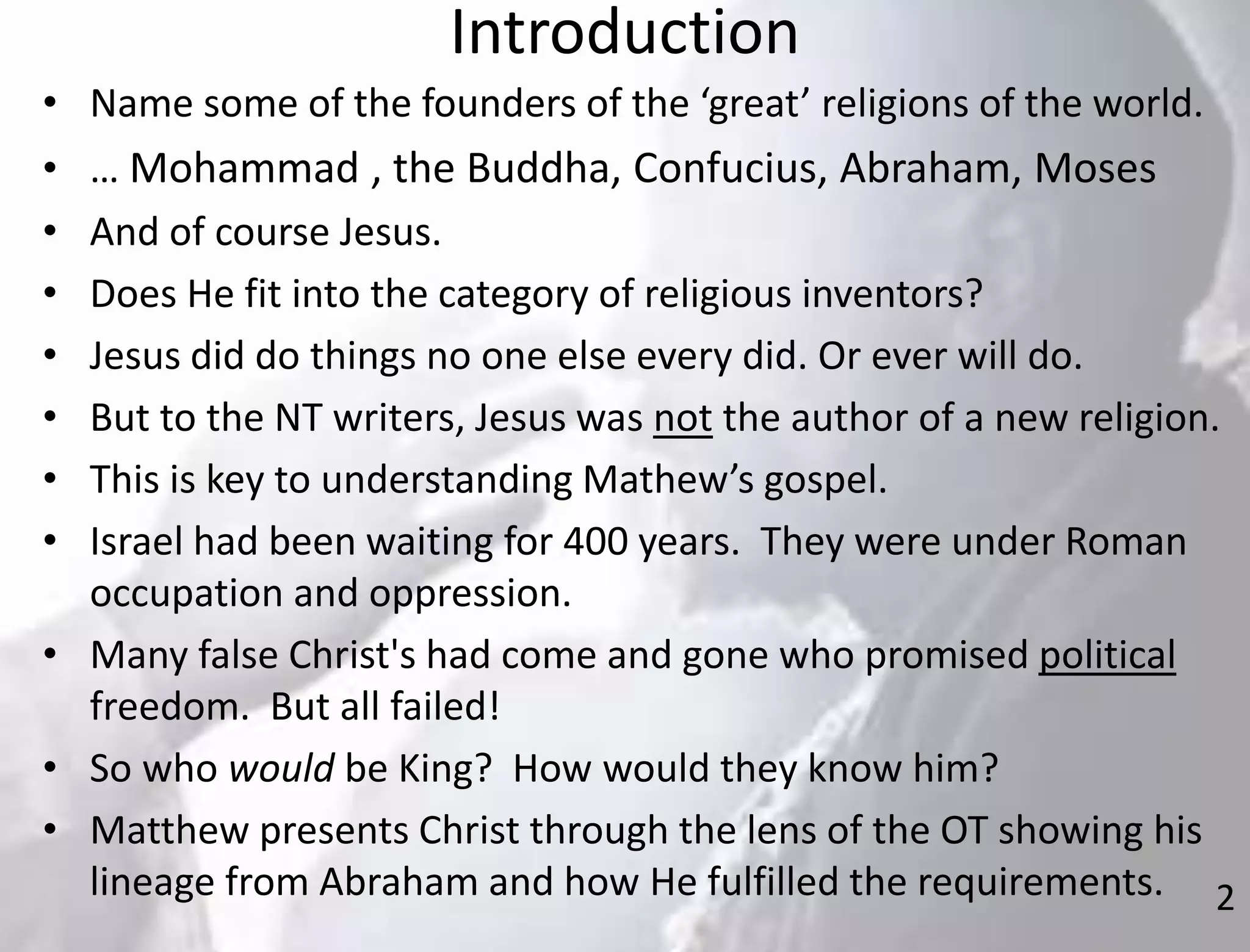 The document provides an overview of the Gospel of Matthew, emphasizing Jesus as the promised King and the fulfillment of the Old Testament prophecies. It outlines Matthew's unique perspective, audience, and structure while highlighting the significance of Jesus' lineage and teachings, particularly his role in fulfilling the law and prophecy. The final sections focus on Jesus' death, resurrection, and the call to spread the Gospel to all nations.