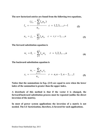 This document discusses two triangular factorization techniques - LU factorization and Cholesky-Coleman matrix inversion - that can be used to solve simultaneous linear equations in matrix form. LU factorization involves factorizing a matrix A into lower and upper triangular matrices L and U. Cholesky-Coleman matrix inversion allows in-situ inversion of a nonsingular square matrix. Optimal ordering techniques are also introduced, which aim to minimize "fill-ins" or new nonzeros generated during factorization or inversion to maintain sparsity. Examples are provided to demonstrate applying LU factorization and Cholesky-Coleman inversion to solve systems of equations.