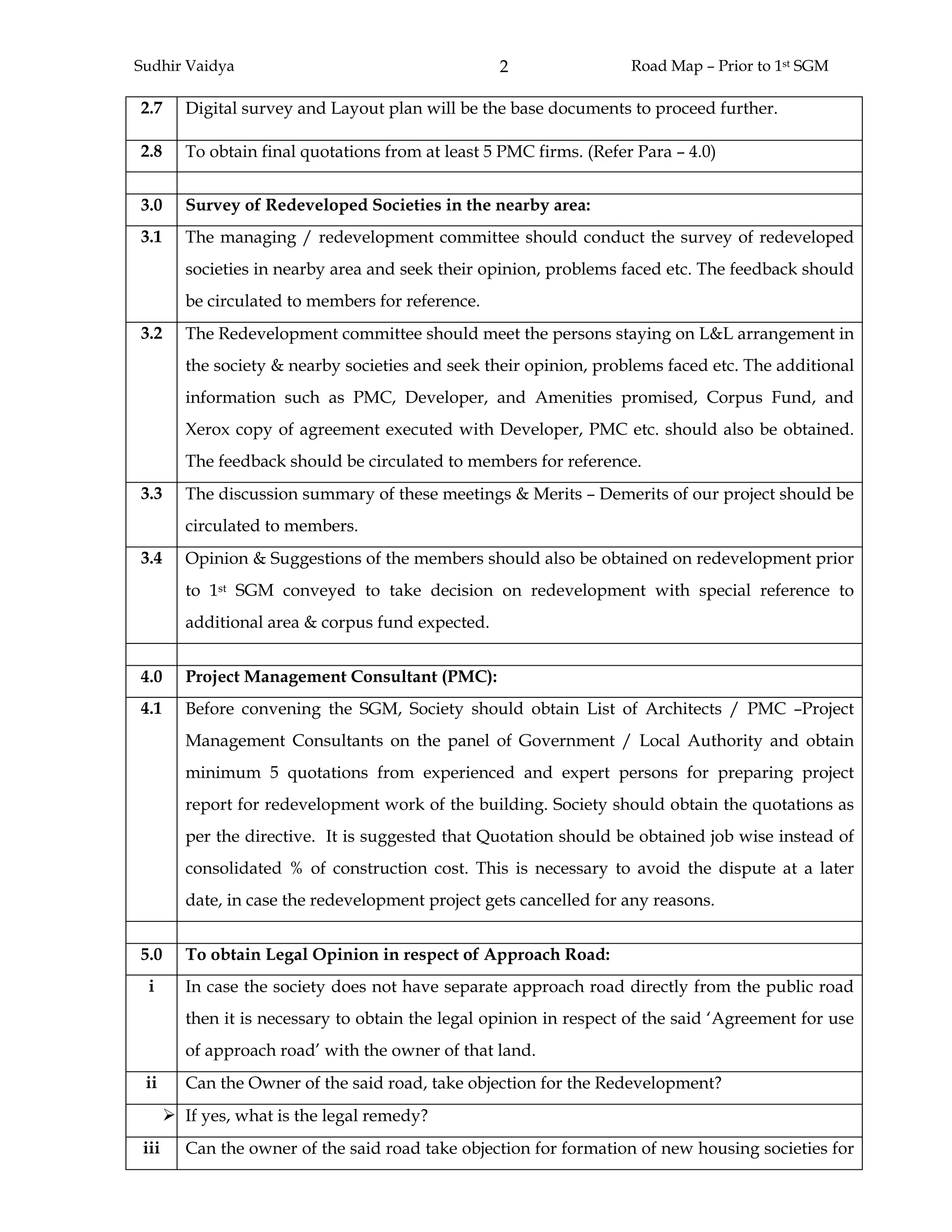 1) The document outlines the steps a housing society should take before convening a special general meeting to discuss redevelopment. This includes conducting structural audits, studying development plans and rules to understand available FSI, surveying the plot, obtaining quotes from project management consultants, addressing legal questions around the approach road, and issuing photo IDs to members.
