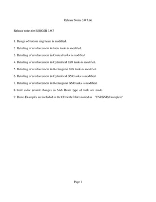 The release notes describe modifications made to the detailing of reinforcement in various types of tanks in ESRGSR 3.0.7, including bottom ring beams, Intze tanks, conical tanks, cylindrical and rectangular ESR tanks, cylindrical and rectangular GSR tanks, and slab beam tanks. The release also includes demo examples in a new Examples folder on the accompanying CD.