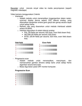 Dokumen ini membahas tentang teknologi video, termasuk sejarah, jenis camcorder, teknik pengambilan gambar, dan sistem transmisi serta standar yang digunakan dalam video digital dan analog. Selain itu, dijelaskan pula mengenai proses digitalisasi sinyal video, kompresi format video, dan berbagai codec yang digunakan untuk penyimpanan dan transmisi video saat ini. Informasi tentang metode pengeditan dan representasi visual juga diberikan untuk memahami bagaimana video diproduksi dan ditampilkan.