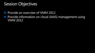 System Center Virtual Machine Manager (VMM) 2012 enables building private clouds and federating them to public clouds. VMM 2012 focuses on fabric management, services, cloud deployment, and fabric management. It allows highly automated management of Hyper-V, storage, networks, and other infrastructure. VMM 2012 also supports building private clouds with capabilities like self-service user roles, quotas, and templates to model multi-tier applications. Additionally, a product called Concero allows extending private clouds built with VMM 2012 into the public Azure cloud for a hybrid approach.