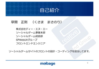 12.4.9 株式会社ディー・エヌ・エー ソーシャルゲーム事業本部 ソーシャルゲーム統括部 SPWebUXグループ フロントエンドエンジニア ソーシャルゲームサイトのフロントの設計・コーディングを担当してます。 2