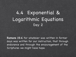 This document contains step-by-step solutions to 6 exponential and logarithmic equations. The solutions involve algebraic manipulation of logarithmic and exponential terms as well as graphical methods. Scriptural context is provided at the beginning emphasizing the instructional value of studying such examples.