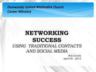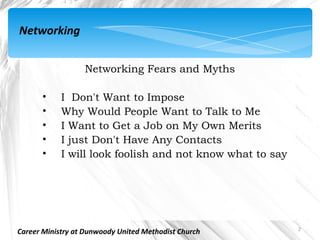 The document discusses networking strategies for career success, including overcoming fears about networking and understanding what networking is and isn't. It provides tips on who to network with using both traditional in-person methods and online/social media platforms like LinkedIn, Twitter, and personal websites. The key message is that networking takes an ongoing effort to expand one's contacts and learn about opportunities, but it is essential for learning about new jobs and opportunities.