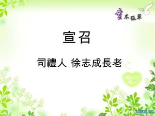 司禮人啟、會眾應 啟:有愛,憂傷的地方會生出美麗的 花朵 應:我們愛你,因為你已經先 愛我們 。