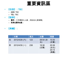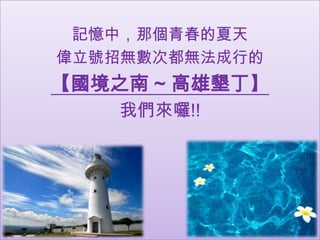 这是一篇关于台湾高雄和垦丁的旅游指南,包含行程安排、住宿、租车和美食推荐等信息。文档详细描述了三天的行程,包括各大景点、餐馆和夜市,旨在提供旅行者实用的建议和美食体验。特别强调了当地的小吃、夜市热闹景象及自然美景。