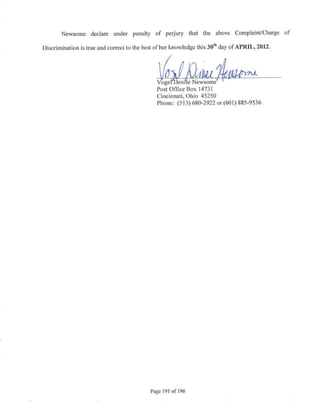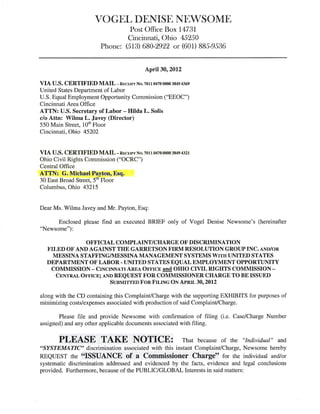 This document presents a complaint filed by Vogel Denise Newsome against the Garretson Resolution Group and Messina Staffing alleging unlawful employment discrimination, including race and age discrimination, along with retaliation for her previous legal actions involving the President of the United States. It details the timeline of events, legal bases for the complaint under Title VII of the Civil Rights Act, and the procedural statutes invoking both the EEOC and Ohio Civil Rights Commission jurisdictions. Newsome claims a hostile work environment and seeks to initiate an investigation into these practices while noting the deadlines for filing discrimination charges.